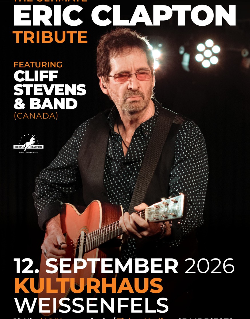 Veranstaltungsort: Weißenfels Kulturhaus 12.09.2026 19:00 Uhr (Einlass 18:00 Uhr) Eric Clapton Tribute-Show - direkt aus Canada: Cliff Stevens & Band