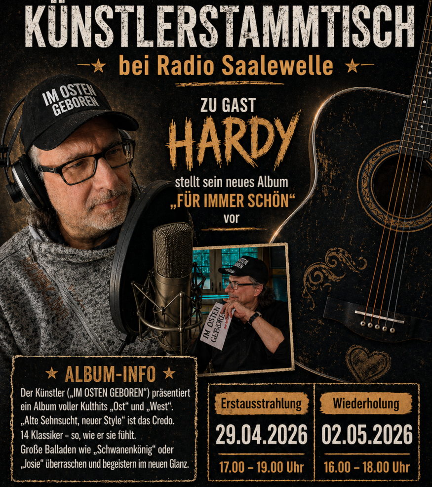 Am Mittwoch, den 29. April 2026, ist Hardy zu Gast beim Künstlerstammtisch auf Radio Saalewelle. In der Sendung stellt er sein neues Album vor und gibt spannende Einblicke in seine Musik.