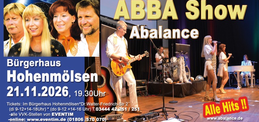 Hohenmölsen – Am Samstag, 21. November 2026 gastiert die ABBA-Tribute-Show ABAlANCE im Bürgerhaus Hohenmölsen (Dr.-Walter-Friedrich-Straße 2). Das Publikum erwartet ein Abend mit den bekanntesten ABBA-Hits – zum Mitsingen, Tanzen und Erinnern.